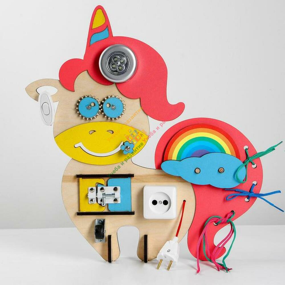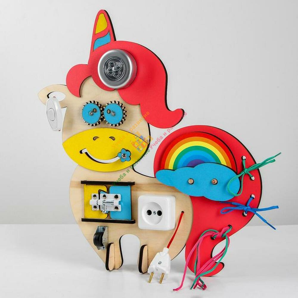 Бизиборд «Единорог» — это обучающая и занимательная игрушка, необычный подарок для любознательных малышей, который развивает воображение и творческое мышление.