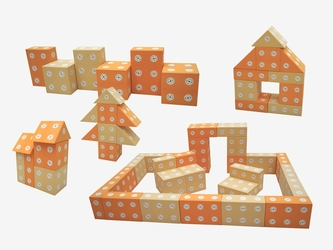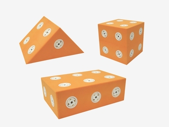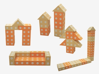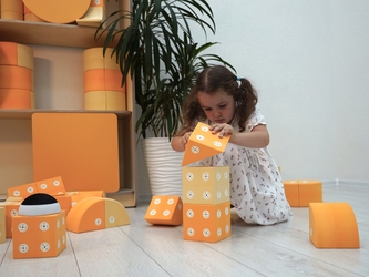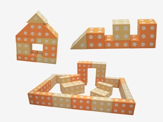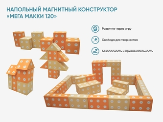 Напольный конструктор выполнен в двух цветах.Крупные детали в виде геометрических фигур выполнены из мягкого гипоаллергенного материала. Крепления имеет магнитную систему для быстрой и простой стыковки-расстыковки деталей. У каждой детали есть от 14 до 24 вариантов магнитной стыковки, что дает полную свободу для творчества.