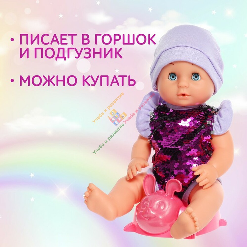 - В комплект входит соска, бутылочка, горшок, тарелочка, подгузник и ложечка. С этими аксессуарами ребёнок придумает множество весёлых игр.