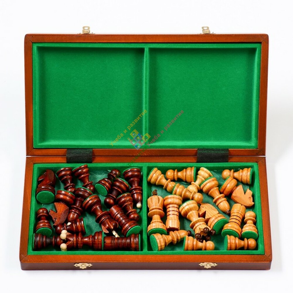 Наличие бархата зеленого цвета добавляет изыска изделию, а для удобного хранения шахматных фигур предусмотрены специальные отсеки, что обусловливает минимум передвижения при переноске.