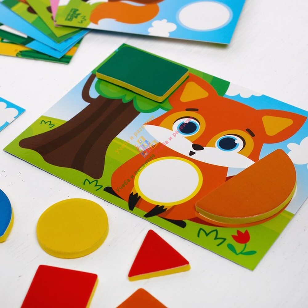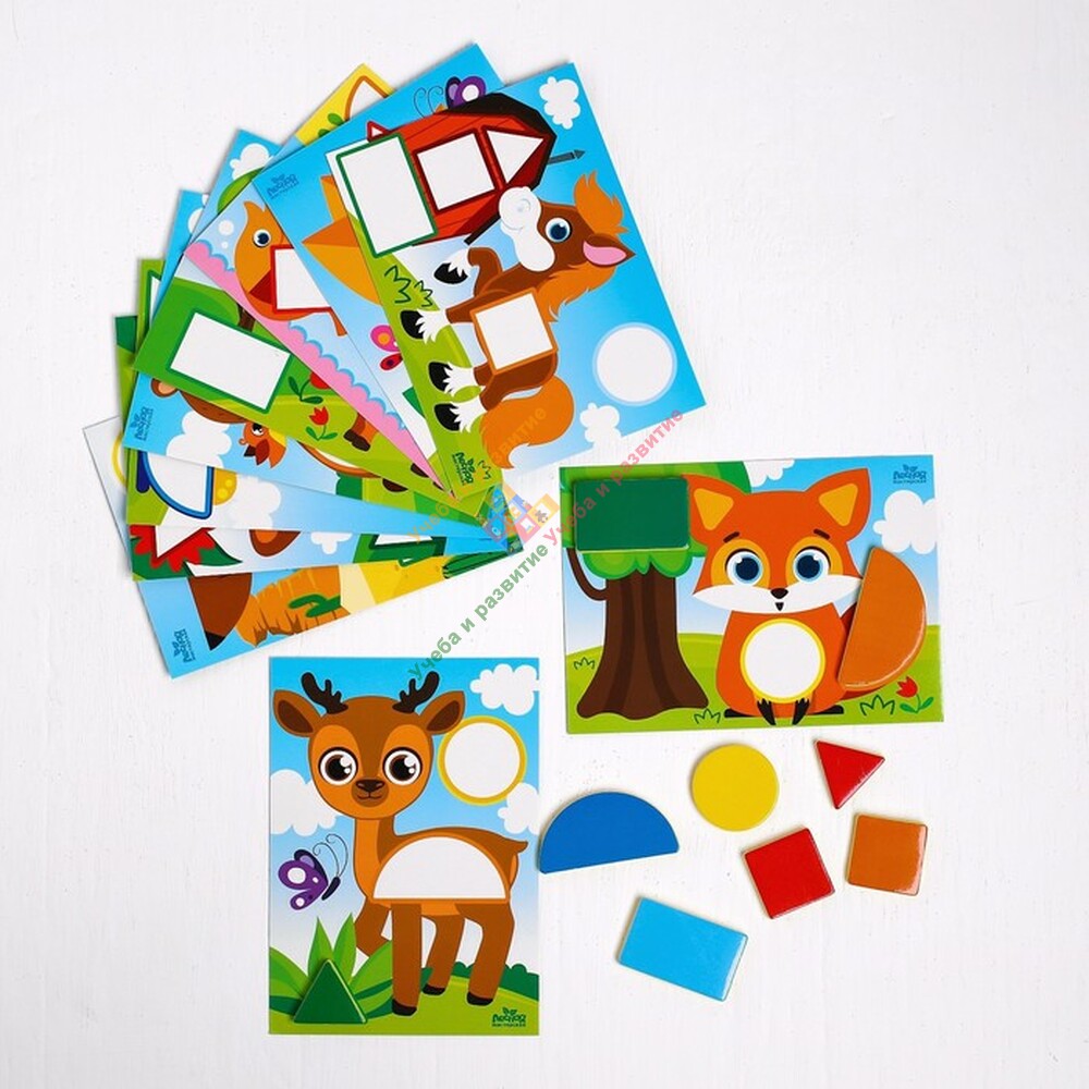 Предложите ребёнку рассмотреть все карточки. Спросите, кто изображён на каждой. Рассмотрите фигуры из набора. Покажите малышу пример, как заполнить пустое поле мозаики.