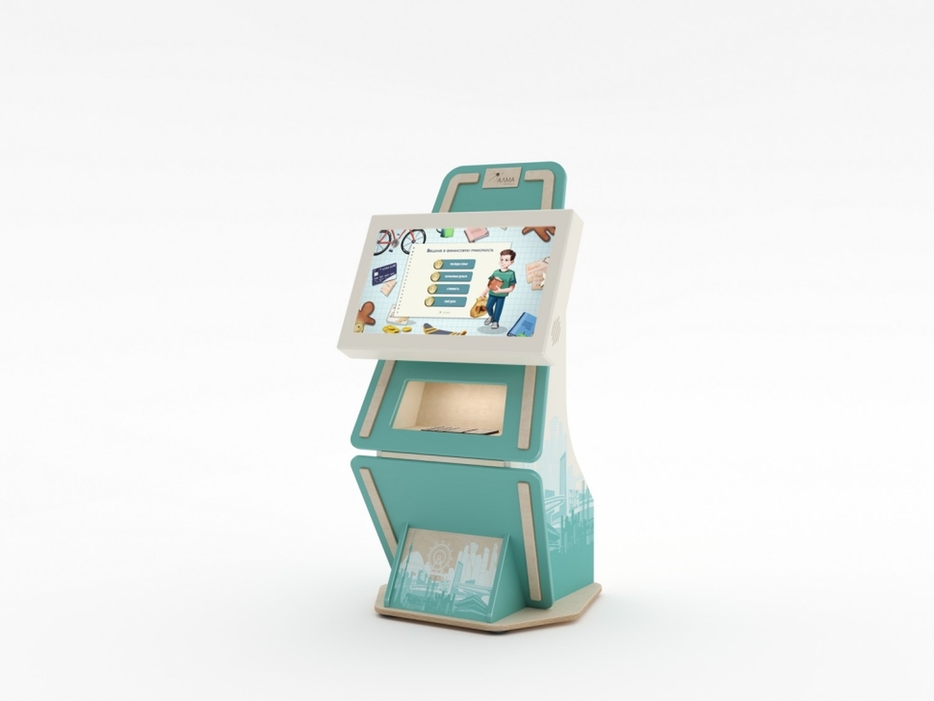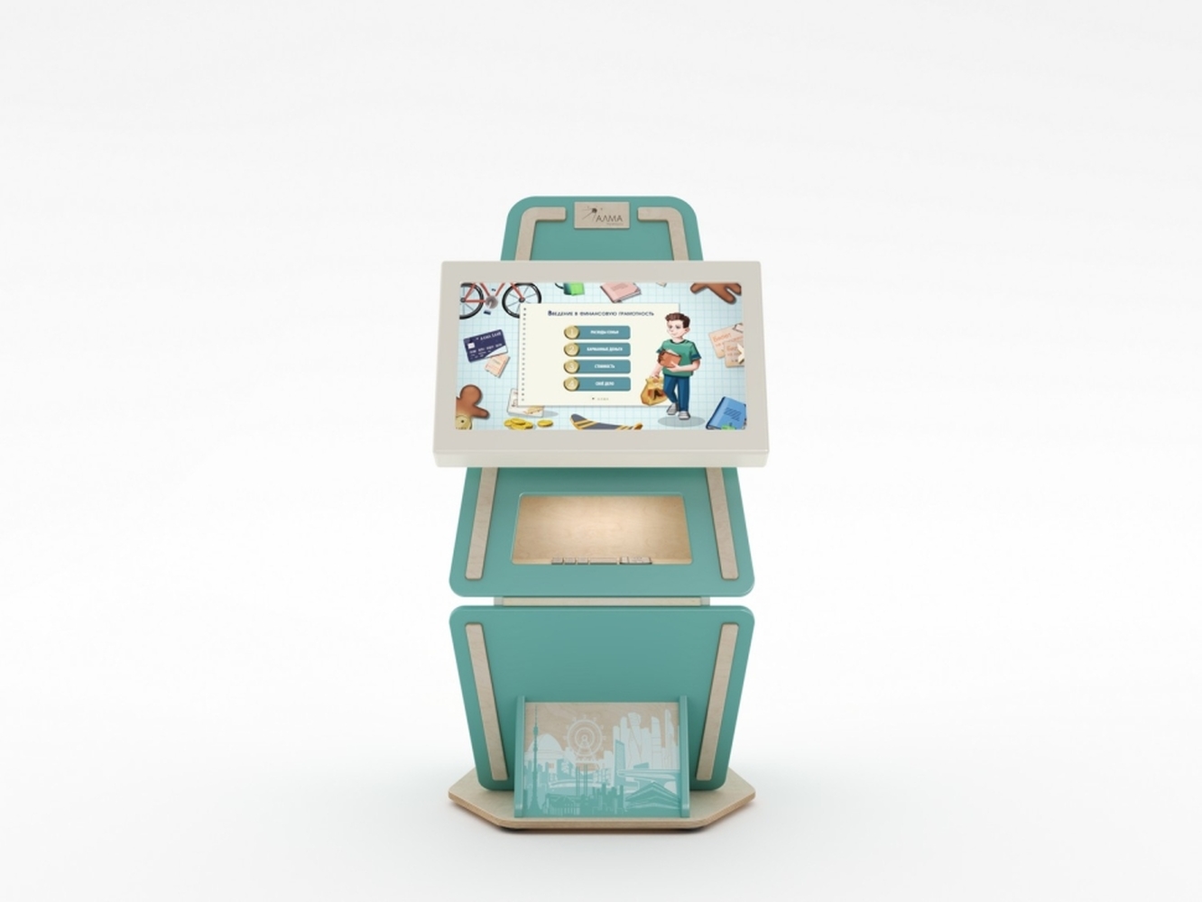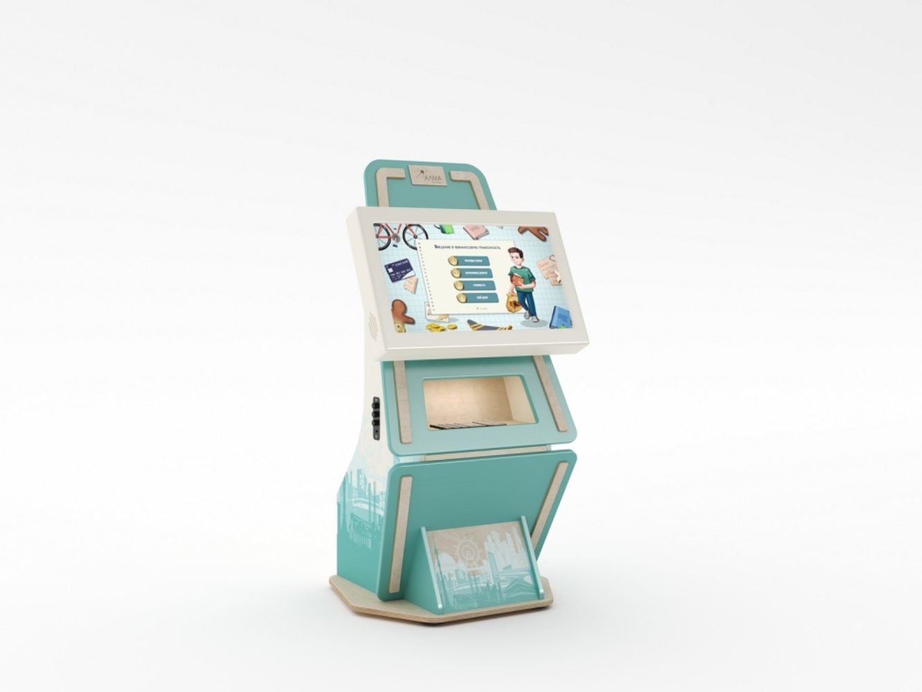 Устройство представляет собой стилизованный под банкомат мультимедийный терминал с сенсорным экраном. Благодаря предустановленному программному обеспечению можно организовать наглядные и интерактивные занятия по финансовой грамотности для дошкольников в детских садах, центрах развития и других образовательных учреждениях.
