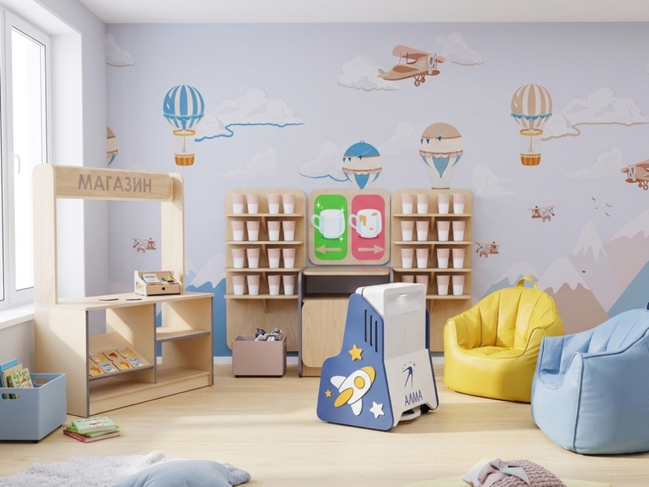 Дизайн комплекса выполнен в спокойных и приятных глазу цветах, поэтому он гармонично впишется как в интерьер учебного заведения, так и игровой зоны в общественных пространствах. Боковые панели с иллюстрациями ракеты создают тематическую атмосферу, располагающую к исследованию и познанию.
