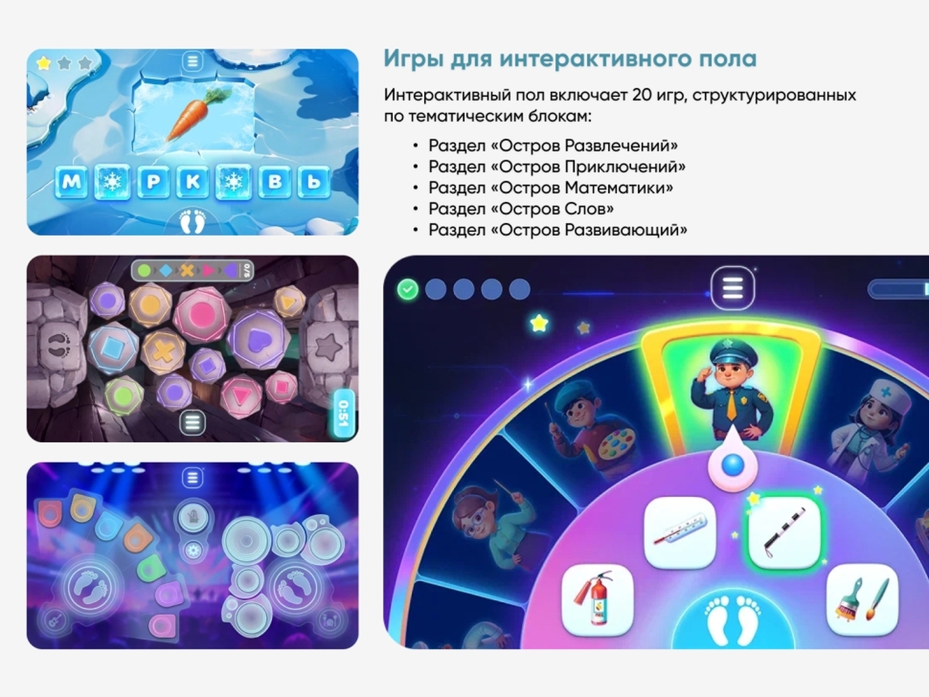 Интерактивный пол включает 20 игр, структурированных по тематическим блокам. Педагоги подбирают материал в зависимости от возраста детей и поставленных образовательных задач.