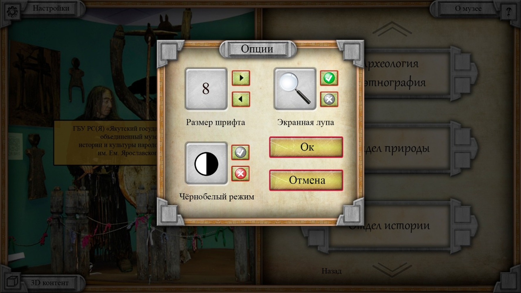 • раздел «Настройки» (изменение размера шрифта для текстовой информации, вкл/выкл экранной лупы и чёрно-белого режима).