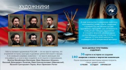 - 30 вопросов интерактивной викторины, позволяющих проверить понимание биографий художников и их легендарных картин, размещенных в крупнейших музеях России, включены в программу. Это мощный инструмент для закрепления материала и мотивации учащихся в увлекательной форме.
