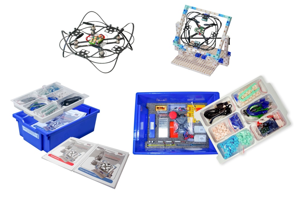 Образовательный модуль позволяет собрать модель квадрокоптера из деталей набора, а после экспериментировать с ним, проводить лабораторные работы, программировать, запускать и планировать траекторию его полетов.