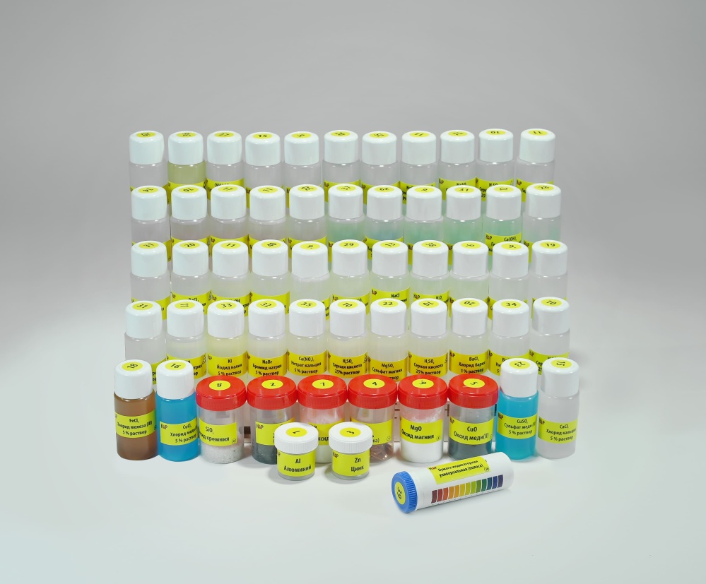 Сухие вещества в пластиковых баночках с завинчивающейся крышкой. Все флаконы и баночки с реактивами имеют наклейку с названием и формулой вещества внутри.