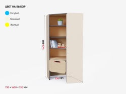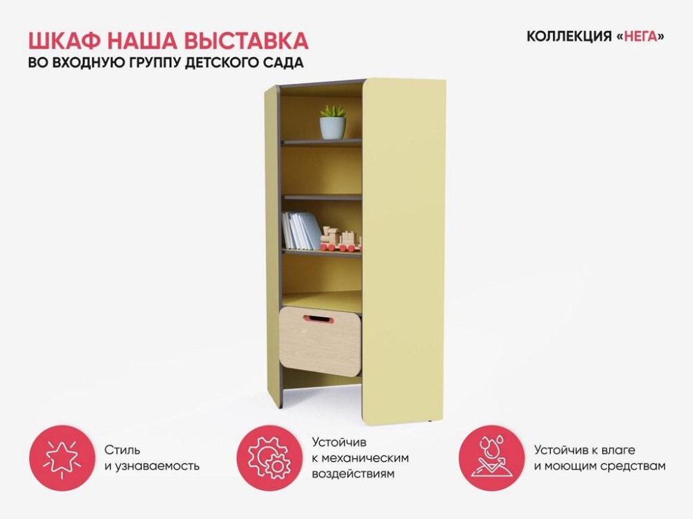 Угловой модуль для демонстрации детских работ. Оснащён глубокими полками для удобного размещения поделок воспитанников. Объединяет остальные модули из коллекции мебели «НЕГА» в единую композицию.