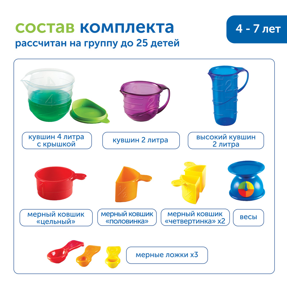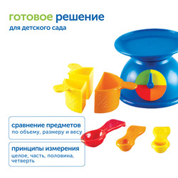 - Учиться сравнивать предметы по объему, размеру и весу с использованием мерных емкостей и весов