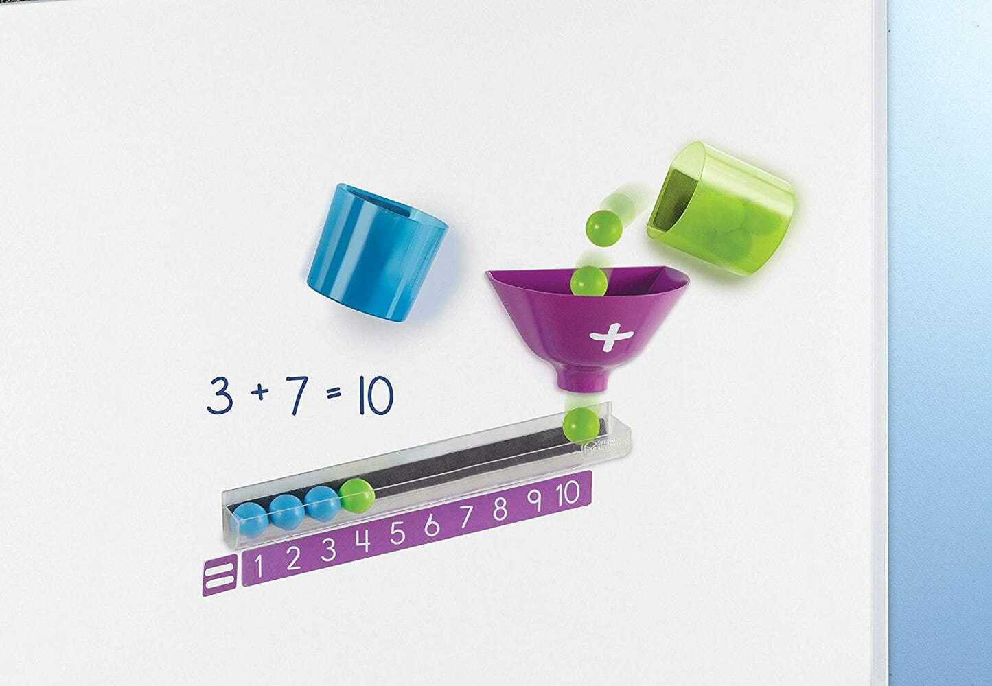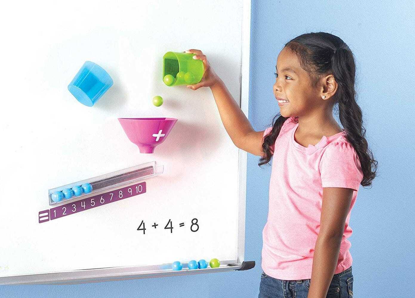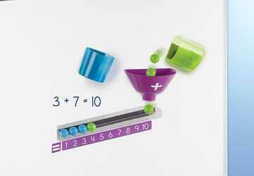 Магнитные компоненты надежно прикрепляются к вашей доске. В комплект входят: две чаши (синяя и зеленая), воронка, подсчетный лоток и 20 шариков (десять зеленых и десять синих) Три простых шага для иллюстрации сложения: Набор развивает навыки счёта от одного до 20, упорядочивания , сравнения: какое число больше или меньше заданного числа. Поместите шарики в соответствующую чашу Наклоните чаши так, чтобы шары попадали в воронку Подсчитайте шарики, когда они приземляются в пронумерованном лотке внизу Размер лотка 28 см