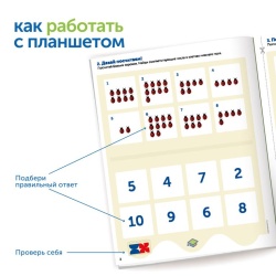 Как работает планшет? Планшет работает по принципу соотнесения вопроса и ответа. Положите числовые плитки на правильные ответы, а затем проверьте себя – переверните планшет и сравните узор с образцом.