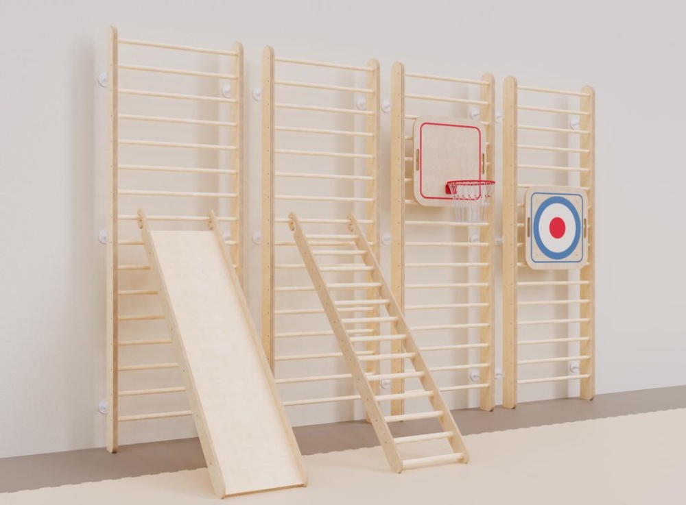 Сочетание классической гимнастической стенки и наклонной доски в одном предмете. Снаряд помогает освоить разные способы лазания, например, чередующийся и приставной шаг (одноименным и разноименным способом), но при этом не подниматься на потенциально опасную высоту.