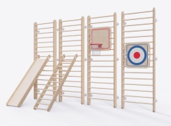 Комплекс состоит из четырех шведских стенок с четырьмя дополнительными спортивными снарядами, которые крепятся на стенку для проведения разных занятий, соревнований и игр.