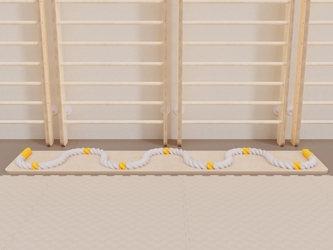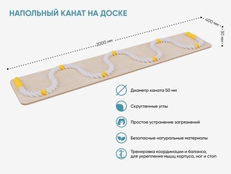 Гимнастический снаряд для детей дошкольного возраста. Подходит для выполнения упражнений на координацию и баланс, для укрепления мышц корпуса, ног и стоп. Ограниченная поверхность доски и зафиксированный на ее поверхности канат — тренажер для ловкости и равновесия.